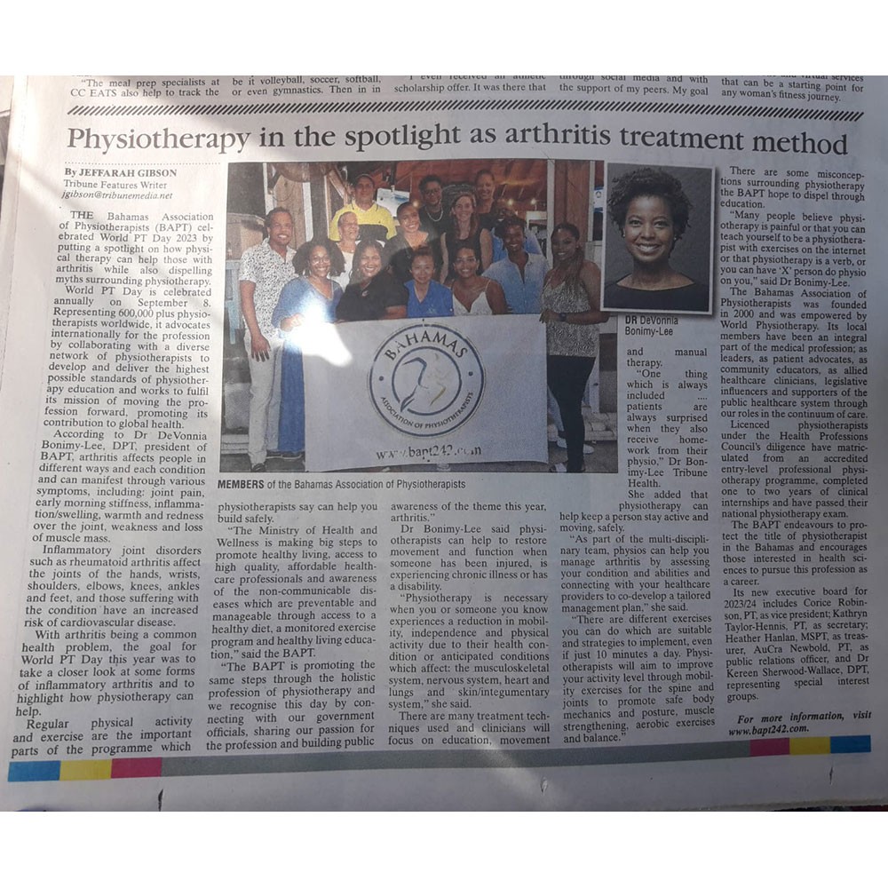 The Bahamas Association of Physiotherapists (BAPT) celebrated World PT Day 2023 by putting a spotlight on how physiotherapy can help those with arthritis while also dispelling myths surrounding physiotherapy.