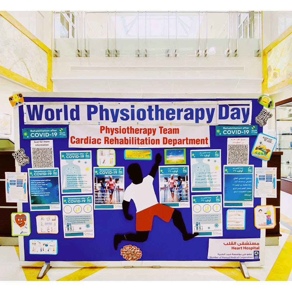 An information board regarding the role of physiotherapy and COVID-19 was set up in the Heart Hospital lobby for the public on 8 September. An information video about “Exercise and wellbeing” was played for the nursing staff in all the in-patient nursing staff rooms and admin staff in Al Qalb HR Building, promoting the importance of exercise during this pandemic.