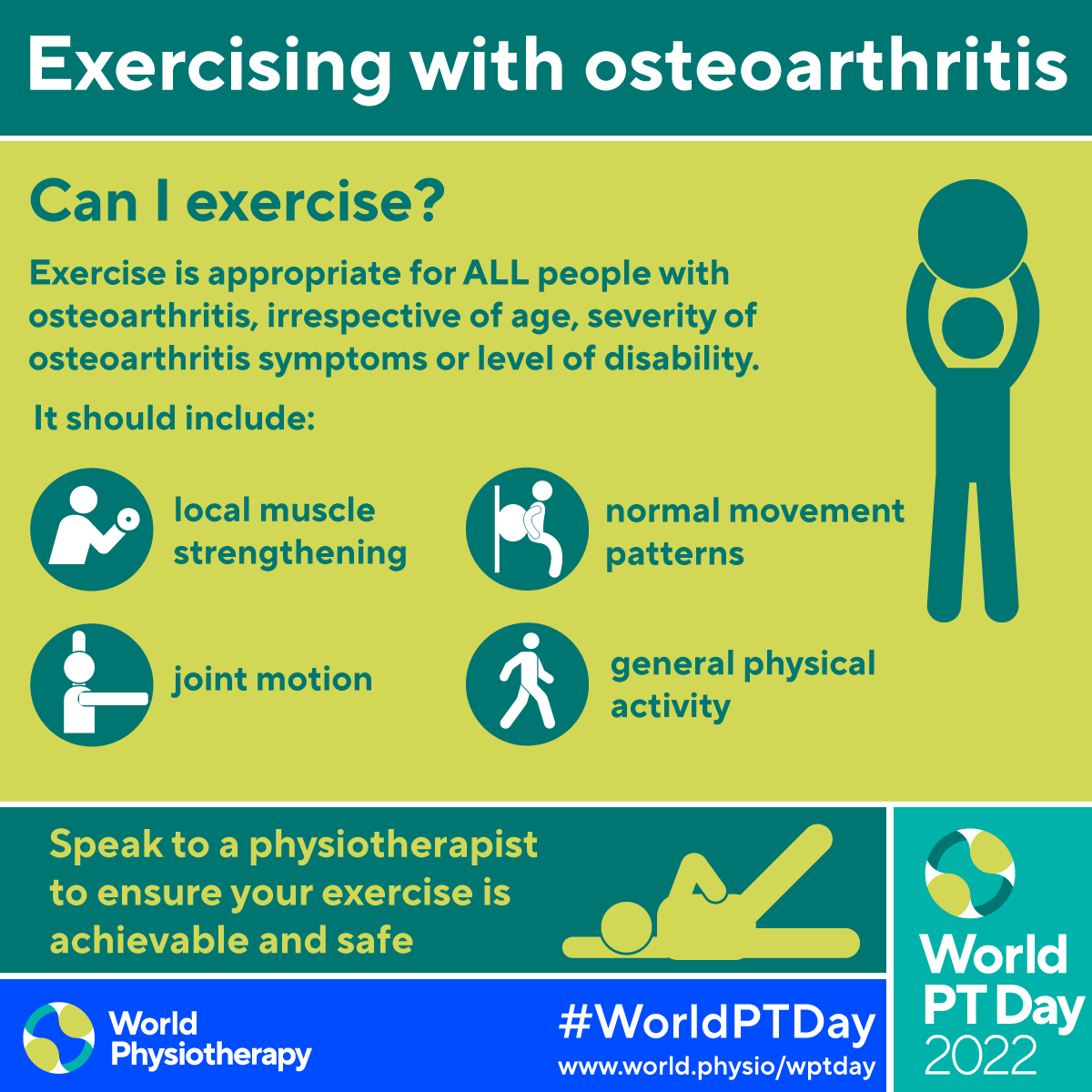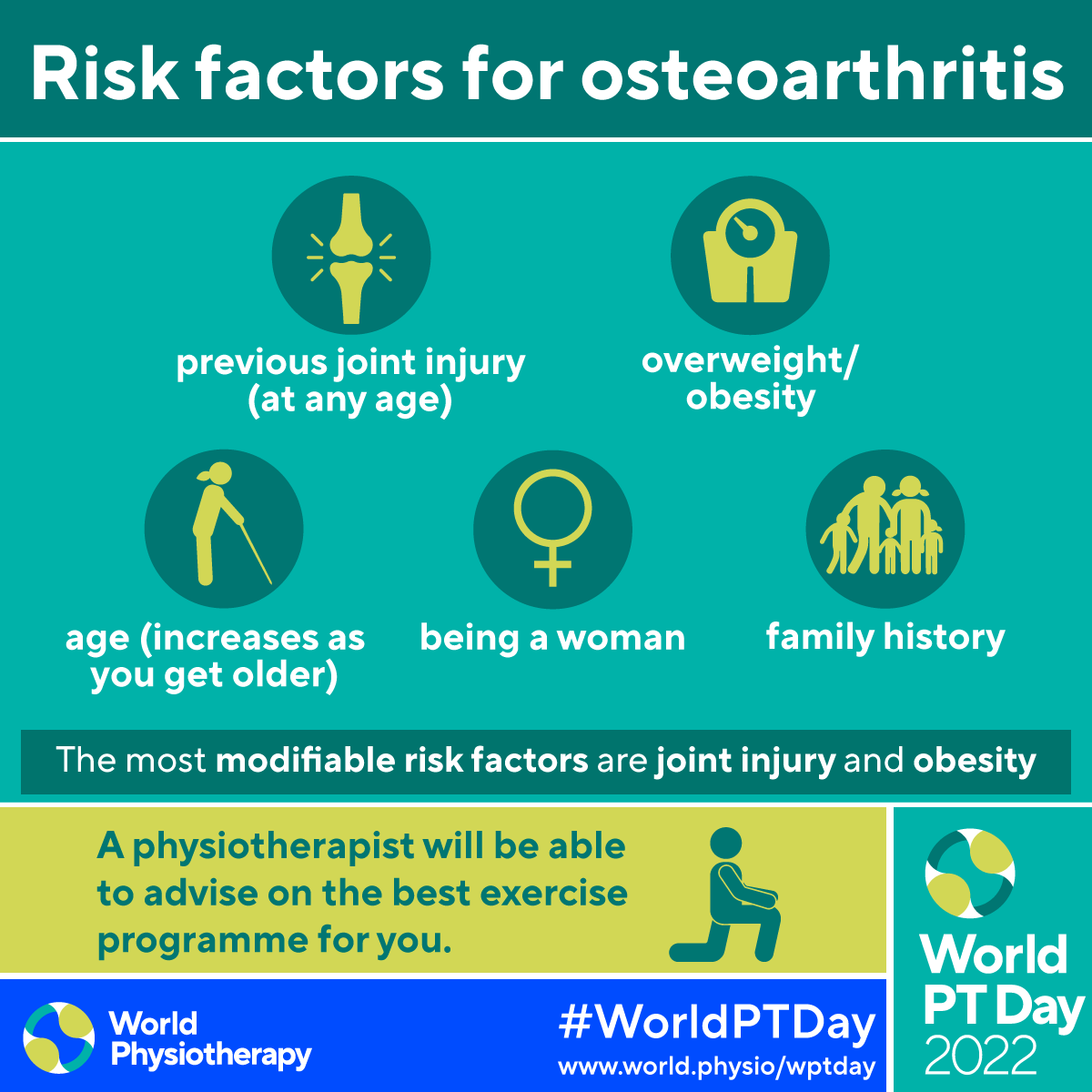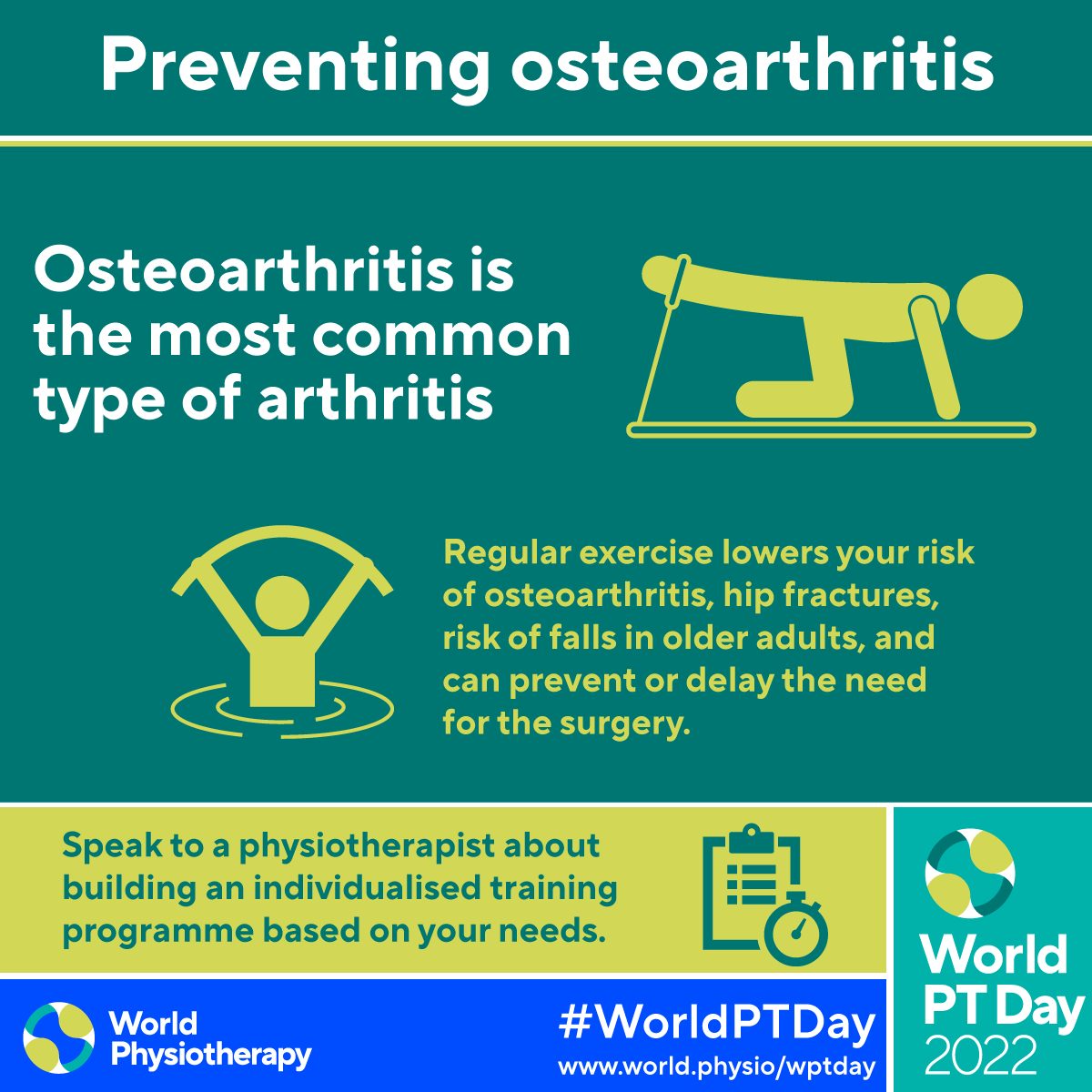 - Download and post one of the ready-made graphics below with messages from the World PT Day 2022 campaign