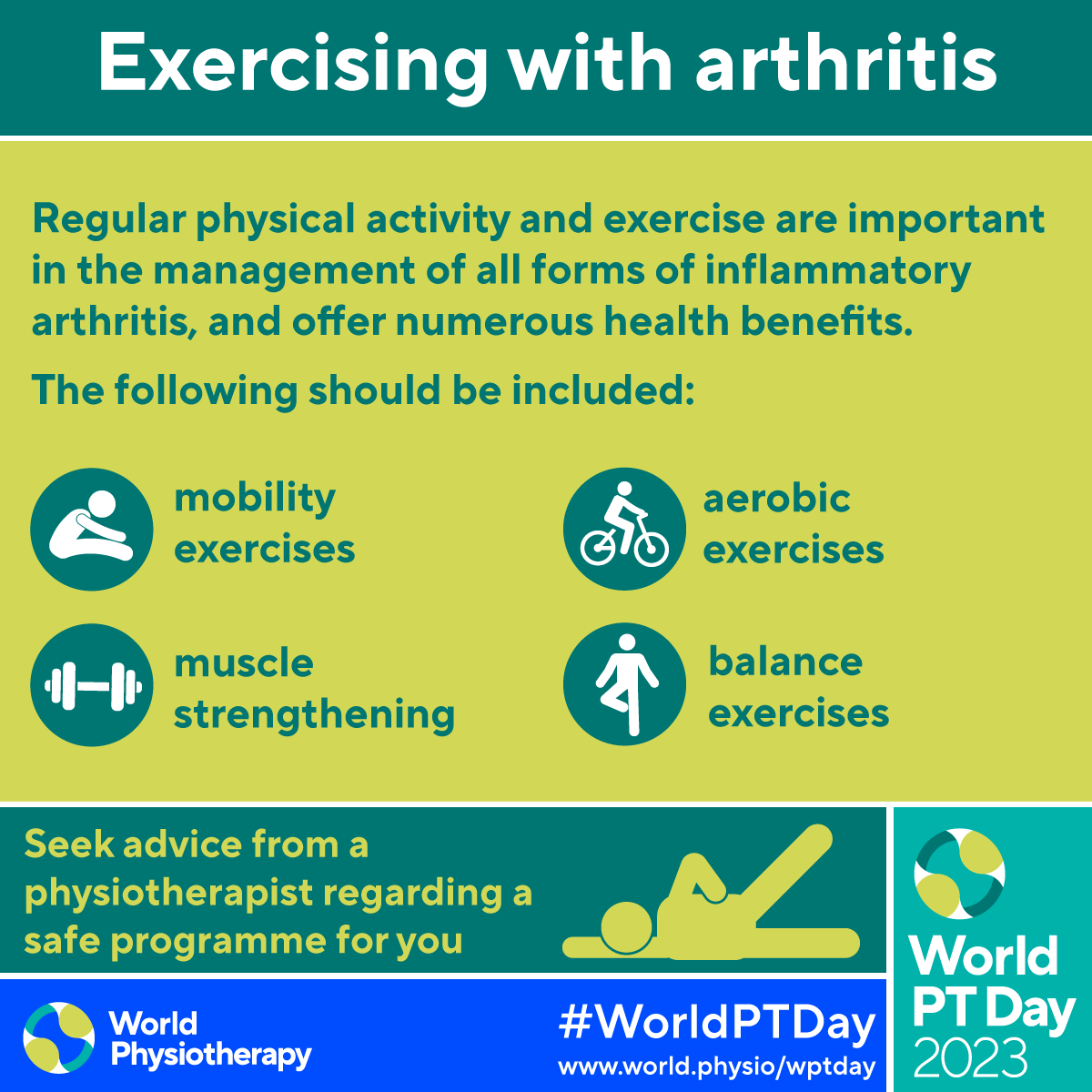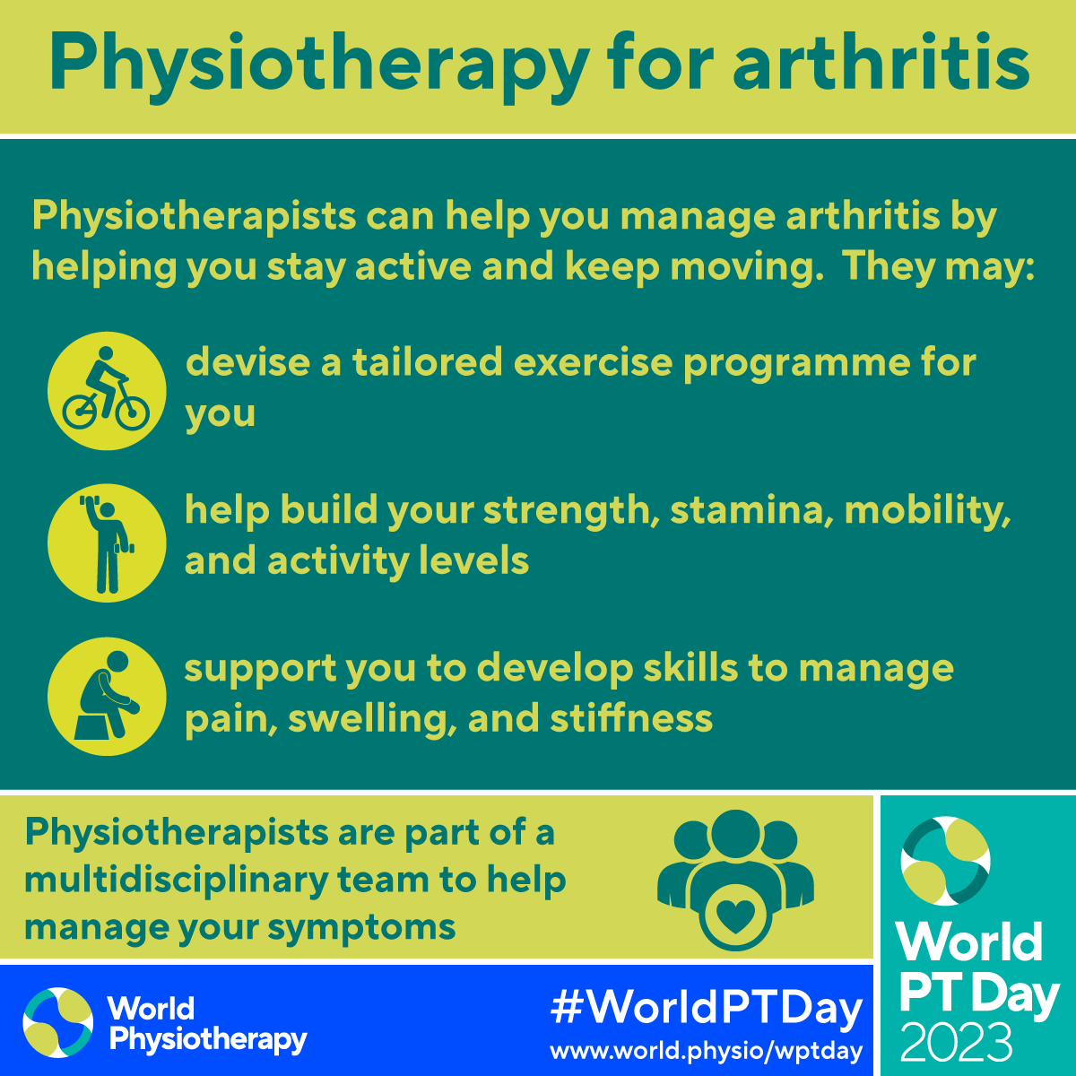 • Download and post one of the ready-made graphics below with messages from the World PT Day 2023 campaign