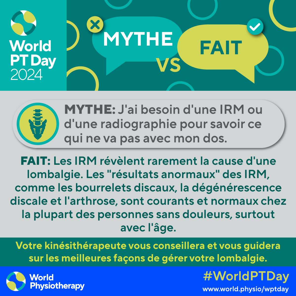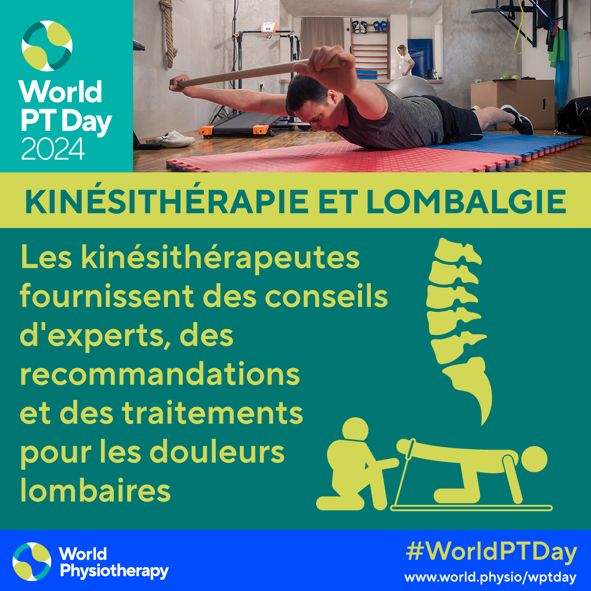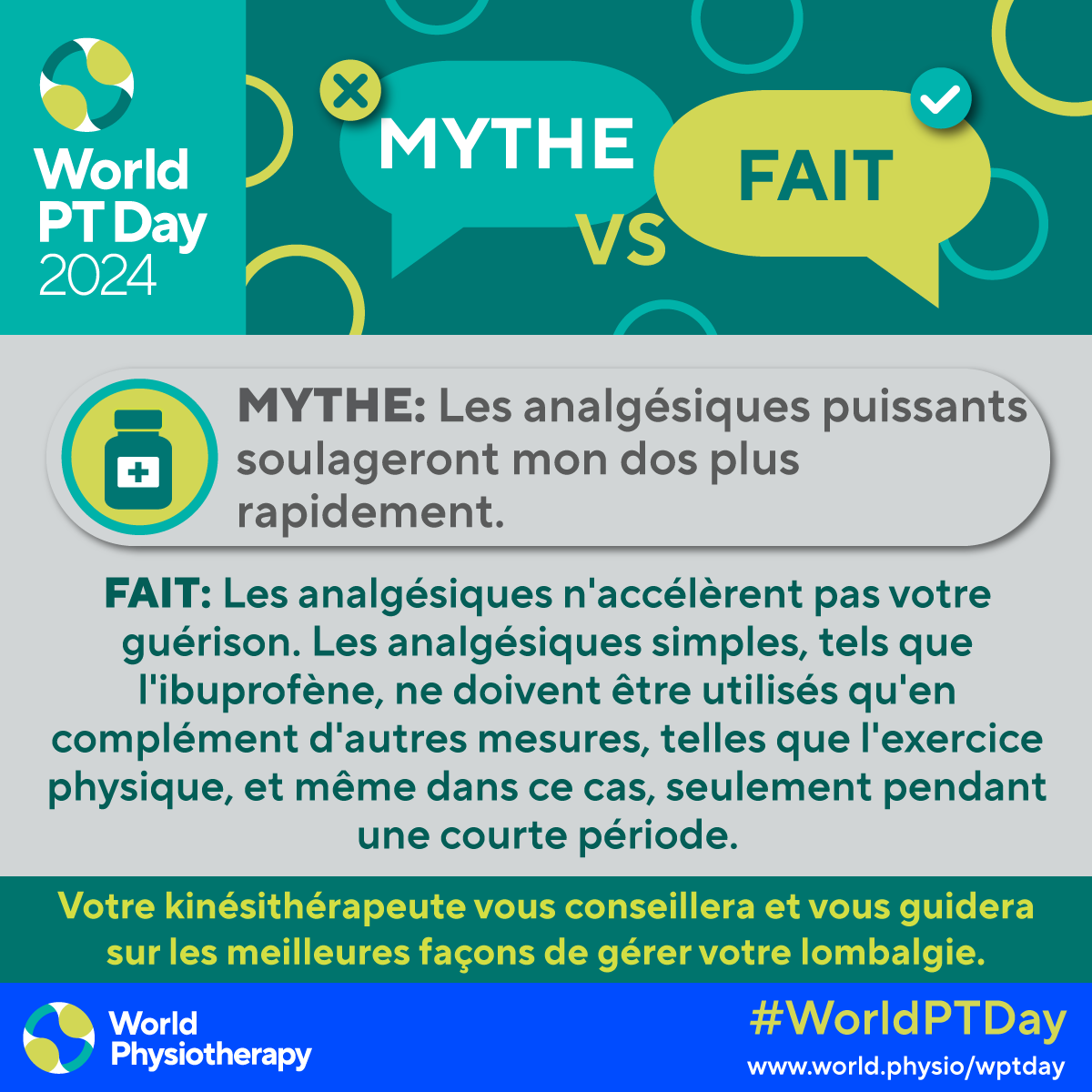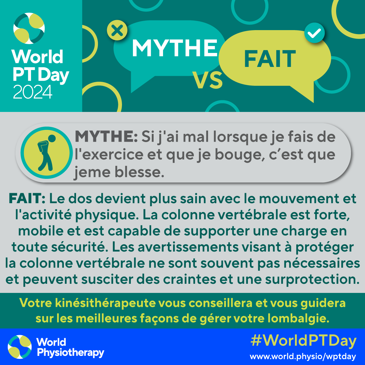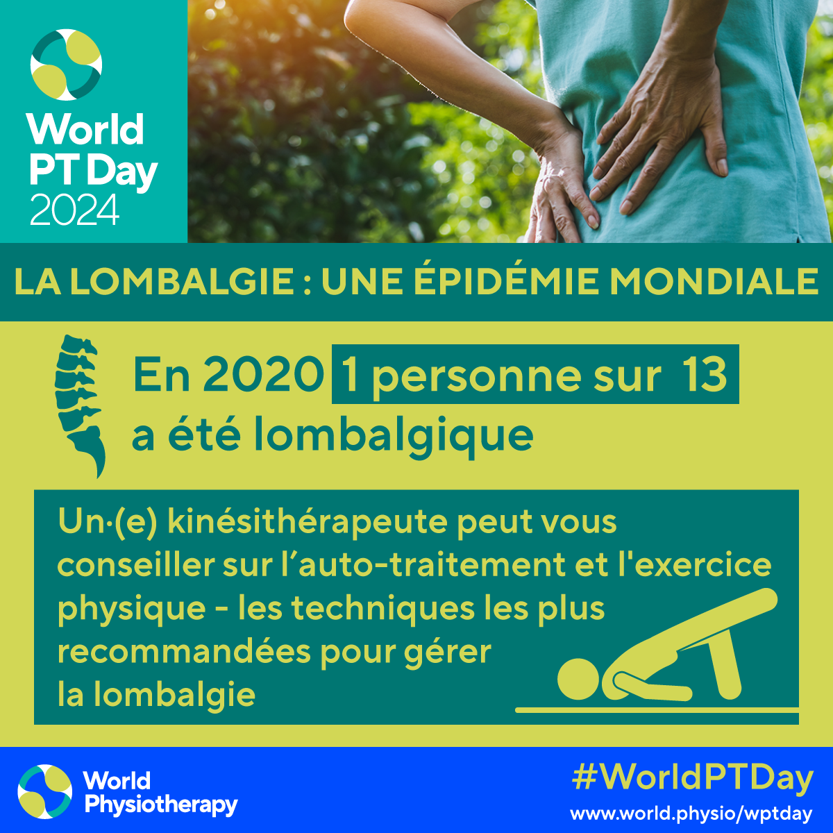- Download and post one of the ready-made graphics in French below with messages from the World PT Day 2024 campaign